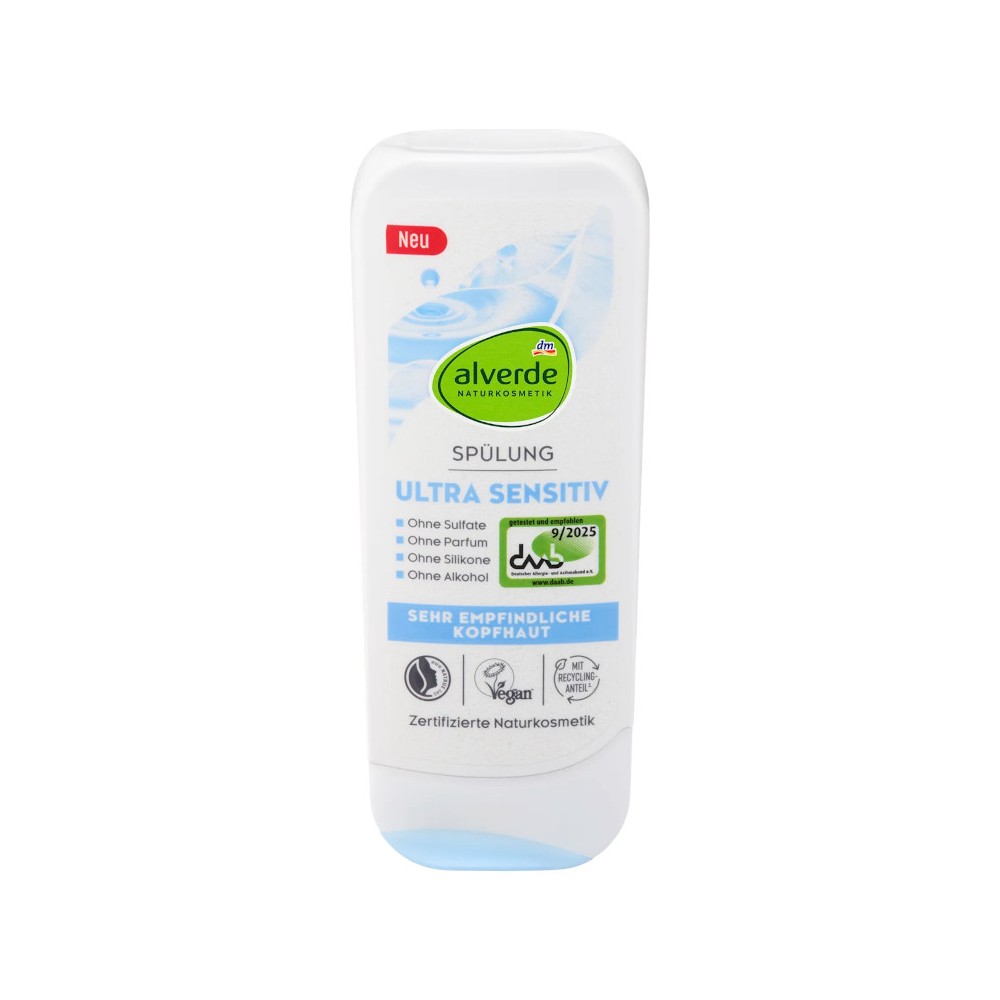 L'après-shampoing Ultra Sensitive Alverde offre aux cheveux un soin particulièrement doux, spécialement formulé pour répondre aux besoins des cuirs chevelus très sensibles. Ses émulsifiants d'origine végétale et sa glycérine hydratante procurent un soin agréable et protègent les cheveux du dessèchement.